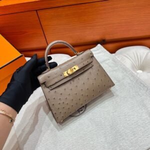 M8 Gris Aslhalte Mini Kelly 19CM KK Ostrich Leather Gold Hardware Full Handmade